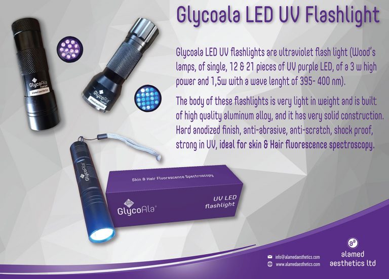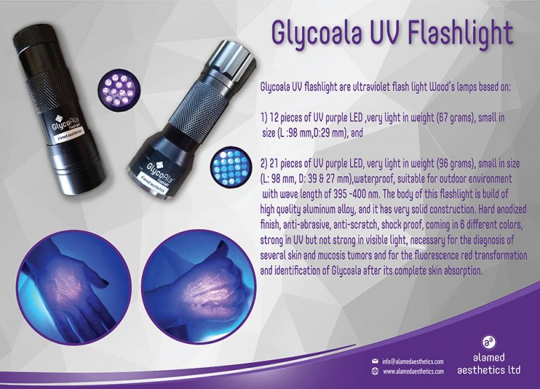 Beyond diagnostic purposes, the GlycoAla UV Flashlight plays a vital role in the activation and fluorescence red transformation of the GlycoAla Gel. Once the gel is applied and fully absorbed into the skin, the flashlight illuminates the treated area, revealing a distinct red fluorescence that signifies the gel’s activation and proper penetration.Key Benefits of GlycoAla UV Flashlight: